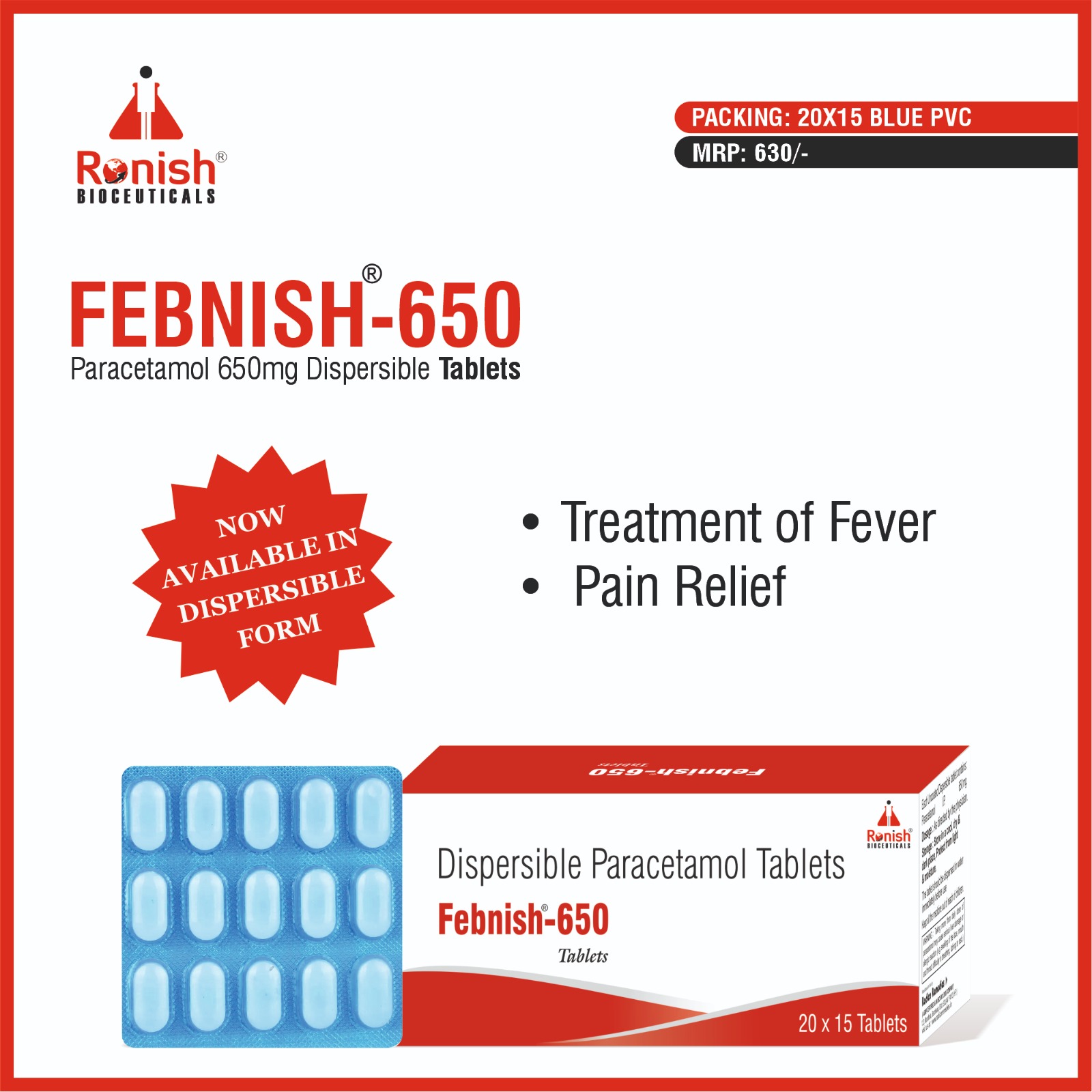 FEBNISH 650 – Paracetamol 650mg Dispersible Tablets is a helpful medicine for reducing fever and easing mild to moderate pain. It supports people dealing with headaches, body pain, toothaches, back pain, and discomfort due to cold and flu. The dispersible form makes it easy to take, especially for those who have difficulty swallowing tablets. It works by lowering fever and calming pain signals, giving relief in a short time. FEBNISH 650 is commonly used for adults and is known for its dependable and gentle action on the body. It helps patients feel comfortable and continue their daily routine without interruptions. The tablet dissolves easily in water, making it simple to use at home or while traveling.