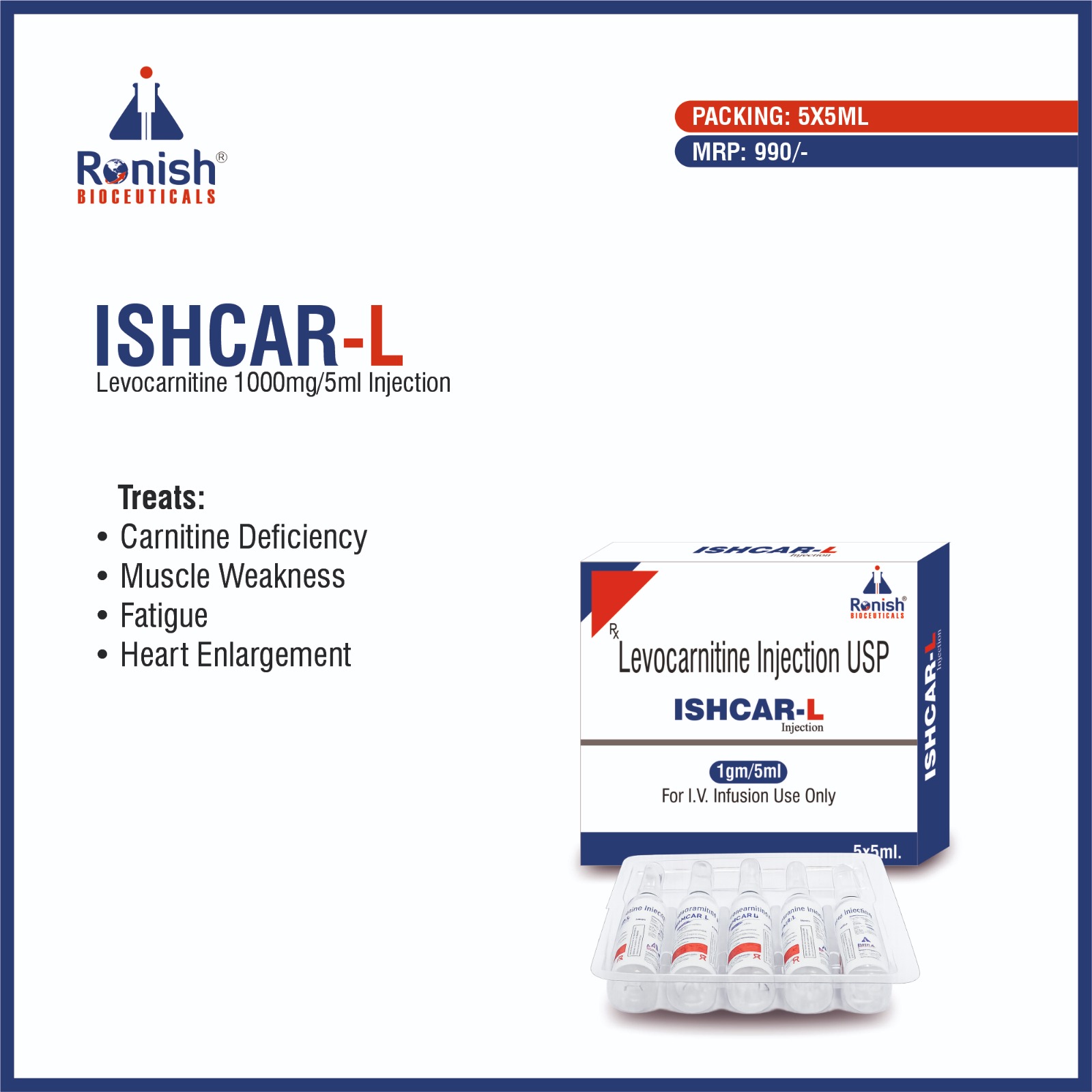 ISHCAR L – Levocarnitine 1000mg/5ml Injection is used to manage carnitine deficiency and help the body produce energy properly. Levocarnitine plays an important role in transporting fatty acids into the cells, where they are converted into energy. This injection is commonly advised in patients with low carnitine levels due to kidney disease, long-term illness, or certain metabolic conditions. It helps reduce weakness, muscle pain, and tiredness, and supports overall metabolic balance. ISHCAR L Injection is suitable for hospital and clinical use under medical supervision and is known for its effective action and good patient tolerance.