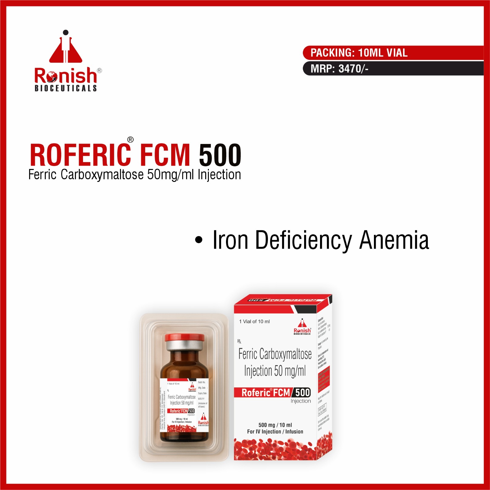 ROFERIC FCM 500 – Ferric Carboxymaltose 50mg/ml Injection is used for the treatment of iron deficiency anemia in patients who cannot take oral iron or need quick improvement in iron levels. This injection helps restore iron stores in the body and supports healthy red blood cell formation. It is commonly prescribed for patients with chronic kidney disease, heavy blood loss, post-surgery weakness, and anemia during pregnancy or after delivery (as advised by a doctor). Uses include correcting low iron levels, improving hemoglobin, and reducing symptoms like fatigue, weakness, dizziness, and shortness of breath. Benefits of ROFERIC FCM 500 include fast action, better iron absorption, fewer doses compared to oral iron, and good patient tolerance when given under medical supervision. It helps improve energy levels, overall strength, and quality of life.