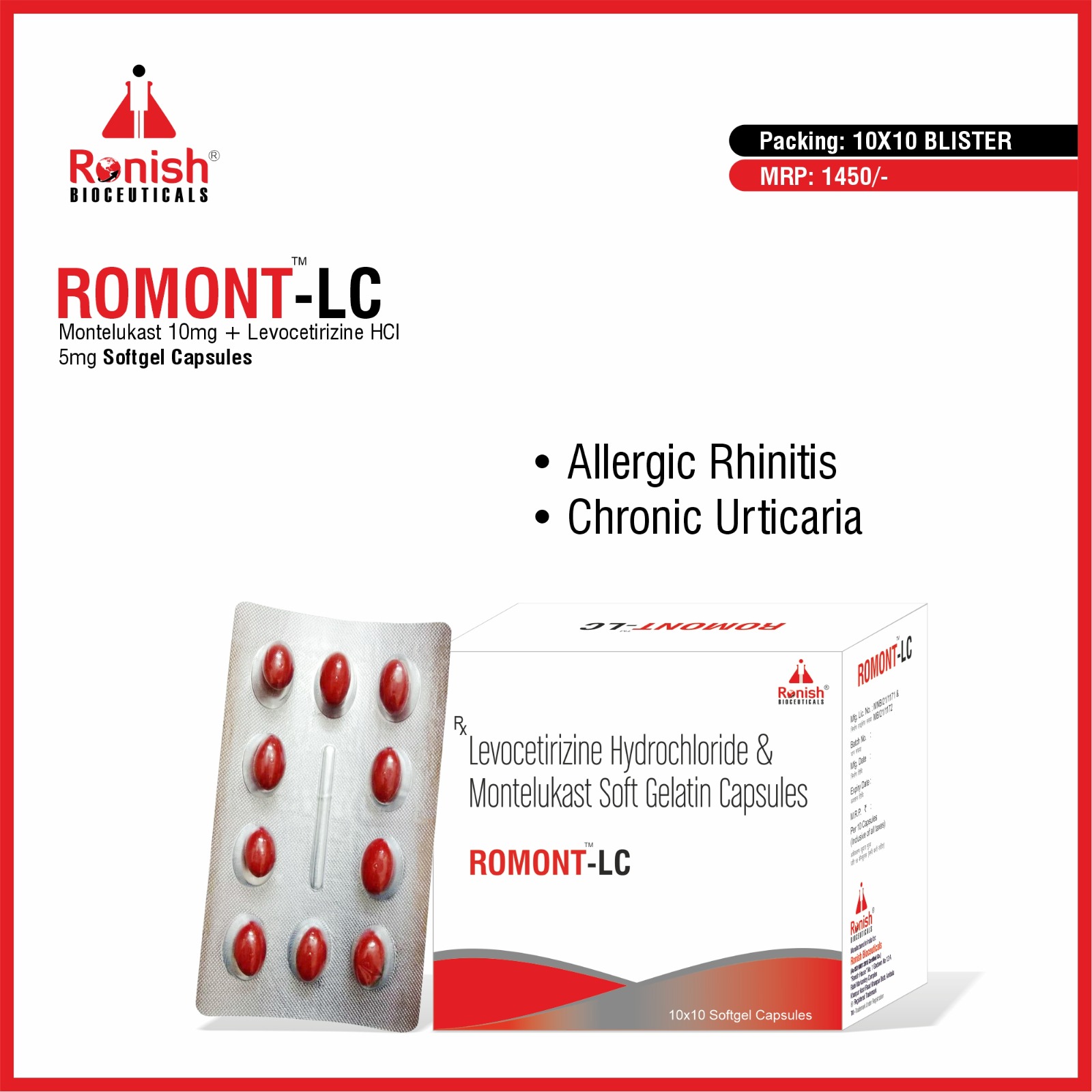 ROMONT LC Softgel Capsules contain a combination of Montelukast Sodium 10mg and Levocetirizine 5mg, used to treat allergies, runny nose, sneezing, watery eyes, and breathing problems like asthma. This medicine helps control allergy symptoms and improves breathing by reducing inflammation and blocking allergic responses.